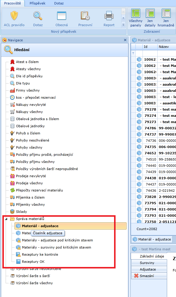 • Receptury ke kontrole: najde materiály, které mají zaškrtnuto, že je lze vyrobit, ale nemají zaškrtnutu kolonku Receptura OK.