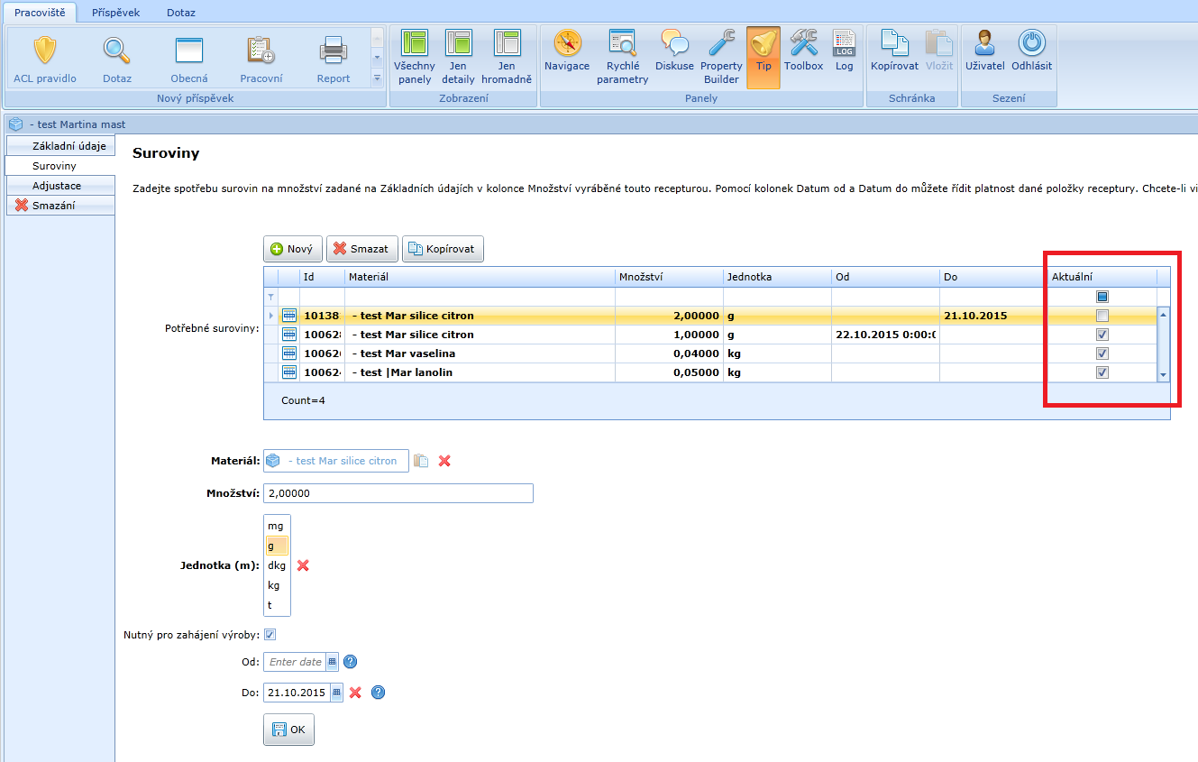 Recepturu je možné v čase měnit. U každé položky lze evidovat její platnost. Protože je v takovém případě receptura nepřehledná. Obsahuje množství položek, z nichž pouze některé jsou aktuálně platné. Orgnes umožňuje definovat výrazy a řádky jednoduše filtrovat. To je využito i u položek receptury. Sloupec Aktuální je výraz, který vyhodnocuje pole datum od a datum do. Nalézt aktuální položky receptury pro koncového uživatele je pak snadné. Stačí kliknout do prvního řádku ve sloupci Aktuální.