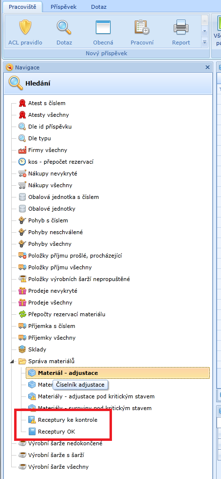 • Receptury OK: najde materiály, které mají zaškrtnuto, že je lze vyrobit a také mají zaškrtnutu kolonku Receptura OK.