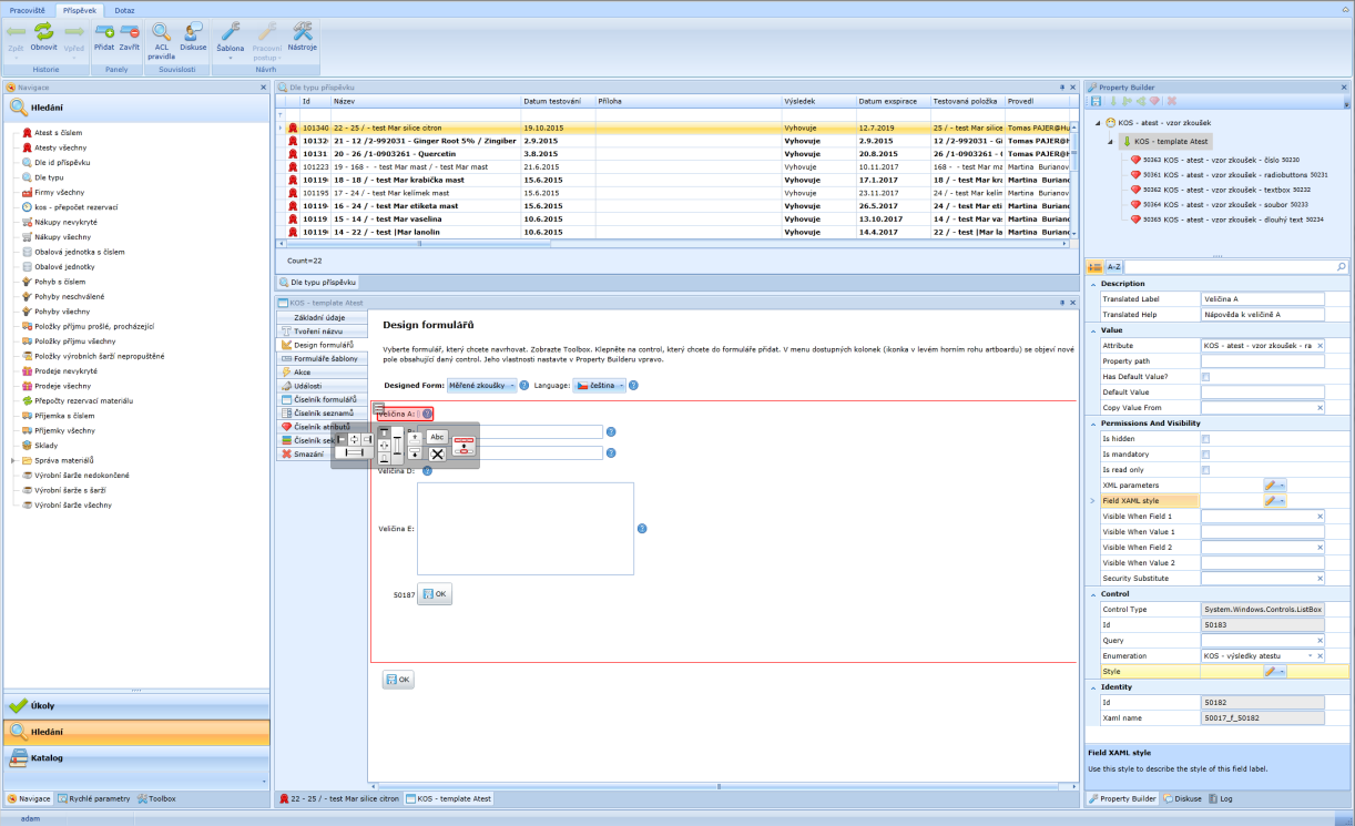 Designer tzv. šablon obsahuje i designer formulářů. Ten se používá na návrh formlářů atestů a certifikátů.