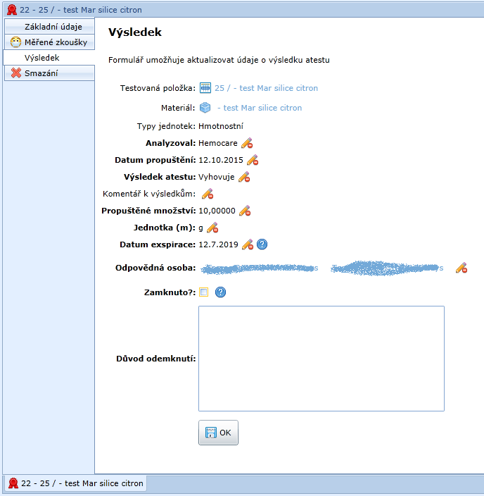 Jestliže je potřeba udělat nějakou změnu, musí požádat pracovníka s rolí QA, aby mu atest odemknul. Ten musí vyplnit povinnou kolonku Důvod odemknutí.