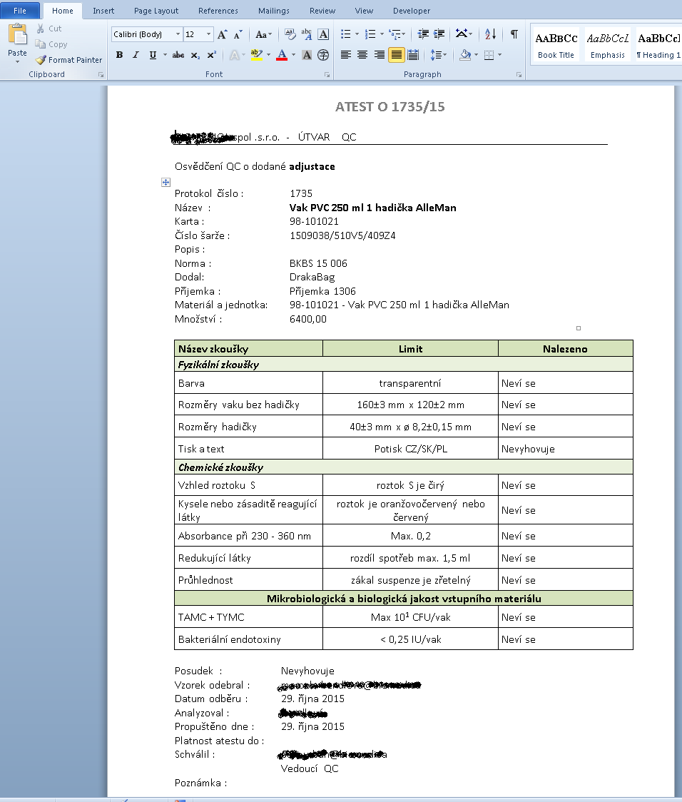 Tisková sestava měřených zkoušek je ve formátu MS Word a je možné ji snadno aktualizovat v režimu řízené dokumentace. Role správce dokumentace předlohu tiskové sestavy ze systému vyndá odemkne, upraví a pak opět vrátí. Nastaví plastnost tiskové sestavy.