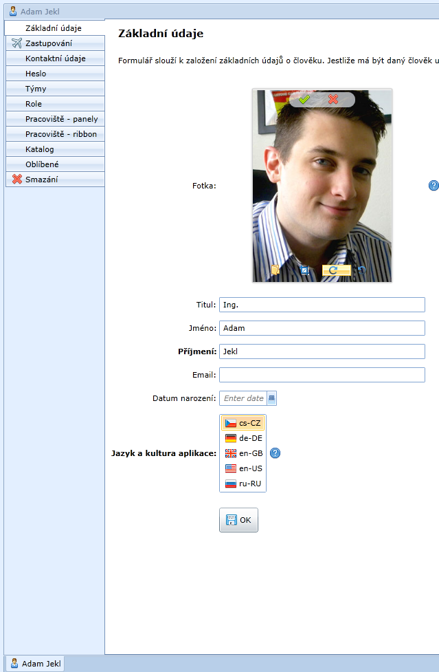 Základní údaje nového uživatele. Kolonka na vstup fotky je editor a umožňuje několik základních operací s obrázkem.