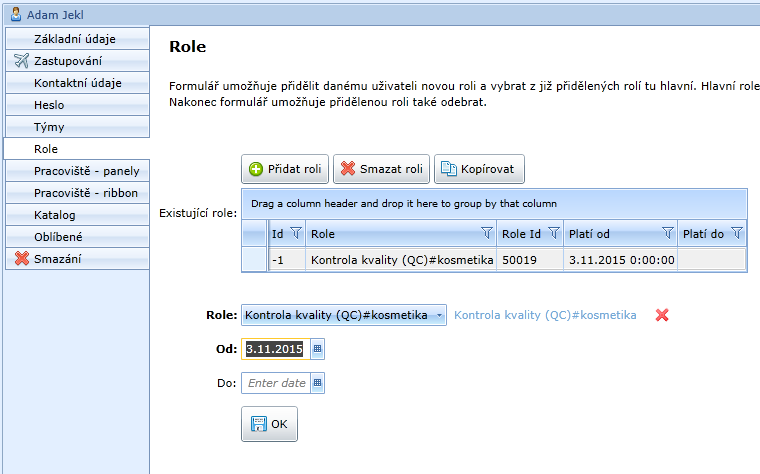 Přidělení rolí uživateli. V případě dočasnosti nemusí administrátor myslet na to, že má roli zase odebrat. Stačí vyplnit kolonku Datum do.