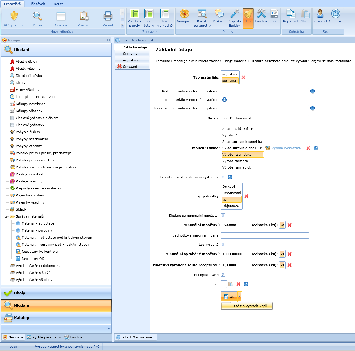 • V případě, že je možné materiál vyrobit, lze definovat recepturu na formulářích Suroviny a adjustace. U receptury se uvádí minimální vyrobitelné množství a množství, na které je daná receptura.