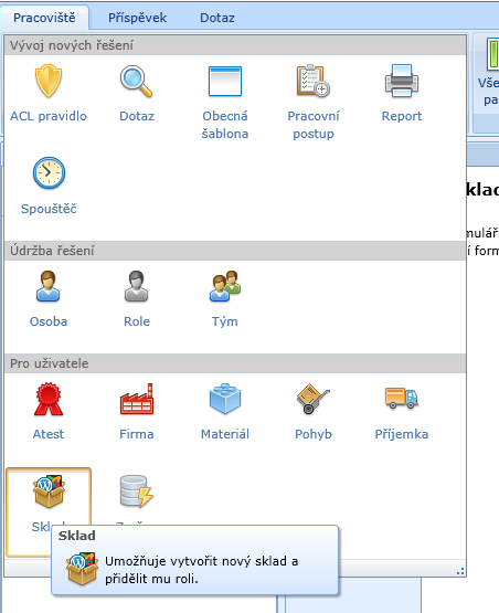Nový sklad lze vytvořit pomocí volby Sklad z galerie Nový příspěvek.