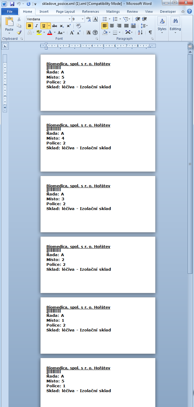 Tisková sestava štítků paletových pozic. Předloha je v MS Word, lze snadno upravit.
